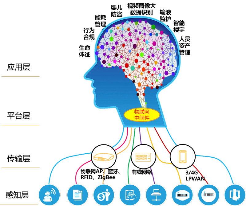 • 第四层为物联网中间件,负责将各种传感器和业务系统采集到的数据与业务系统对接;
