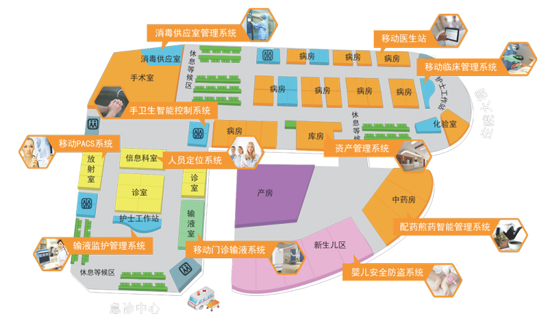 在妇产科,婴儿被盗、抱错等事故常有报道。借助医疗物联网技术,可以实现母婴配对,当母亲标签和婴儿标签靠近时,如果匹配则通过认证,否则告警;利用电子围栏技术,在病区门口,通过近距离定位器结合门禁系统,能够在未授权婴儿靠近出口的时候报警,并完成门禁自动落锁功能,防止婴儿被盗。在感染科,SARS等严重感染病患者是禁止私自外出的。通过电子围栏技术,同样可以防止重感染病人私自外出问题。