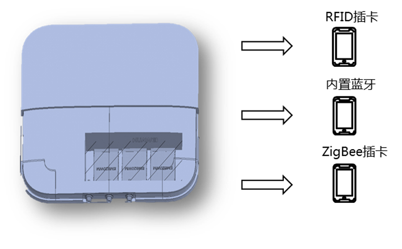 现阶段医疗物联网硬件和软件是强绑定关系,不同厂商之间的硬件和软件系统是不能天然融合的。武汉亚心医院建设中,为了打造覆盖全院的物联网信号,选择华为物联网AP,将无线接入点设备内部集成了WIFI射频的同时,支持标准的蓝牙4.0,通过PCIE插槽扩展RFID 433Mhz、125Khz射频,插卡通过内置的方式集成在产品中,作为一款定制化的产品支持医疗物联网应用,如下图所示华为AP4050DN-E架构。这种方案的优点是能够一套网络满足多套信号的覆盖,在建设上可以避免重复投资、浪费资源。
